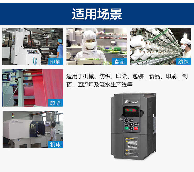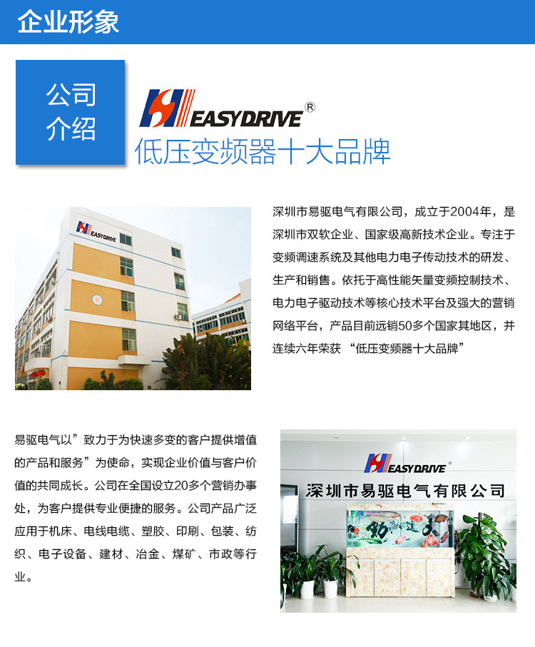易驱电气致力于为快速多变的客户提供增值的产品和服务,实现企业价值与客户价值的共同成长。公司在全国设立20多个营销办事处,为客户提供专业便捷的服务。公司产品广泛应用于机床、电线电缆、塑胶、印刷、包装、纺织、电子设备、建材、冶金、煤矿、市政等行业。