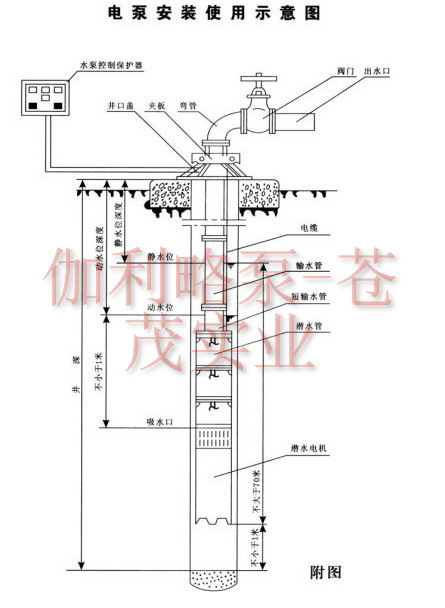 2.水泵进水口必须在动水位1米位以下,但潜水深度不得超过静水位以下70米,电机下端距井底水深最少在1米以上。
