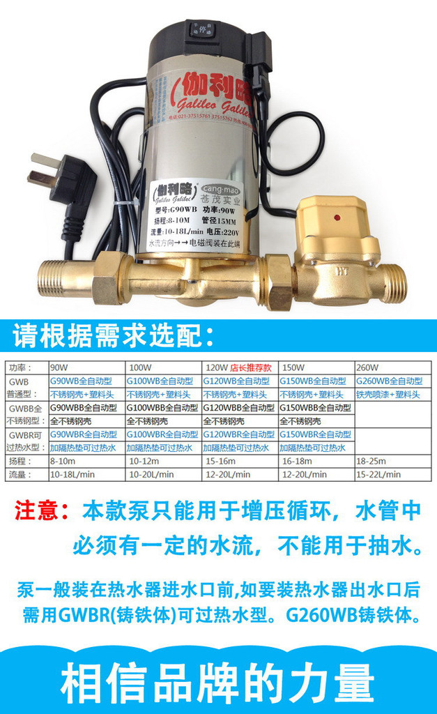 使用范围:热水器增压,解决热水器忽冷忽热,温度过高,水压过低无法打开问题.(泵一般装在热水器进水口前,如要装热水器出水口后需用GWBR加隔热垫可过热水型)
