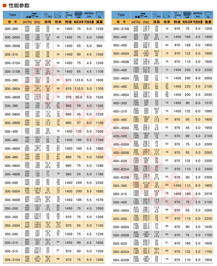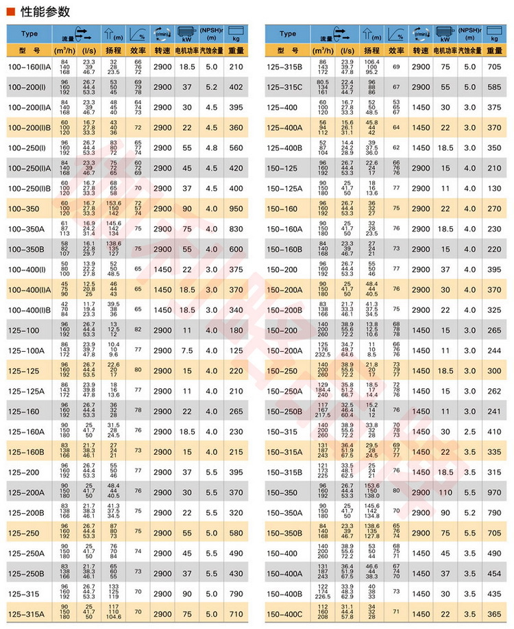 流量范围1.5~1200m3/h,扬程范围8~150m,分基本型、扩流型、A、B、C切割型等250多种规格。根据流体介质和温度不同,设计制造成同性能参数的IRG型热水泵、IHG型化工泵、YG型油泵和IHGB型防爆化工泵系列产品。