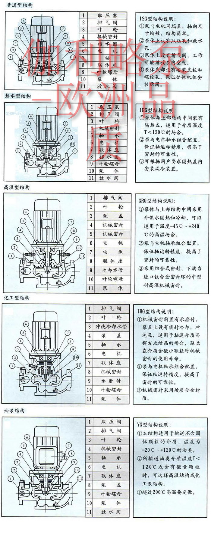 2. IRG型立式热水管道泵适用于冶金、化工、纺织、木材加工、造纸以及饭店、浴室、宾馆等锅炉高温热水增压循环输送以及城市住房采暖循环用泵,使用温度120℃以下。