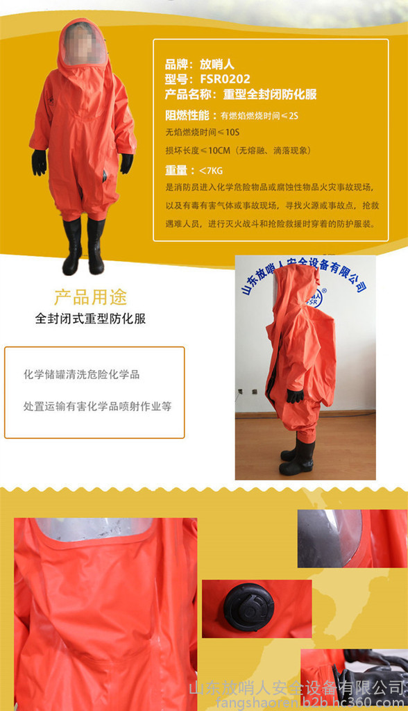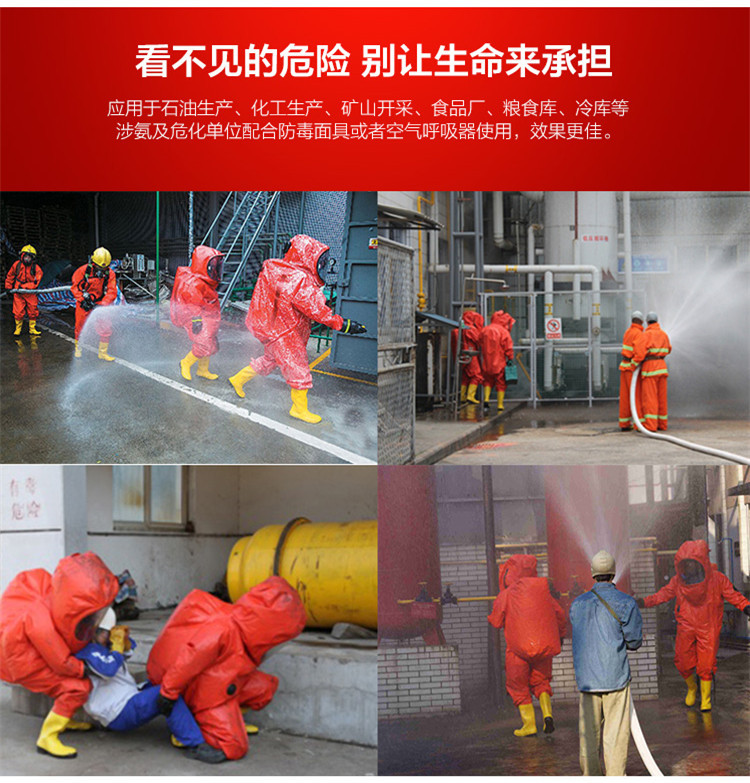 防化服是一种由头罩、连衣裤、防化手套、防化胶靴连为一体的防化服装,使用时与正压式消防空气呼吸器配合使用。