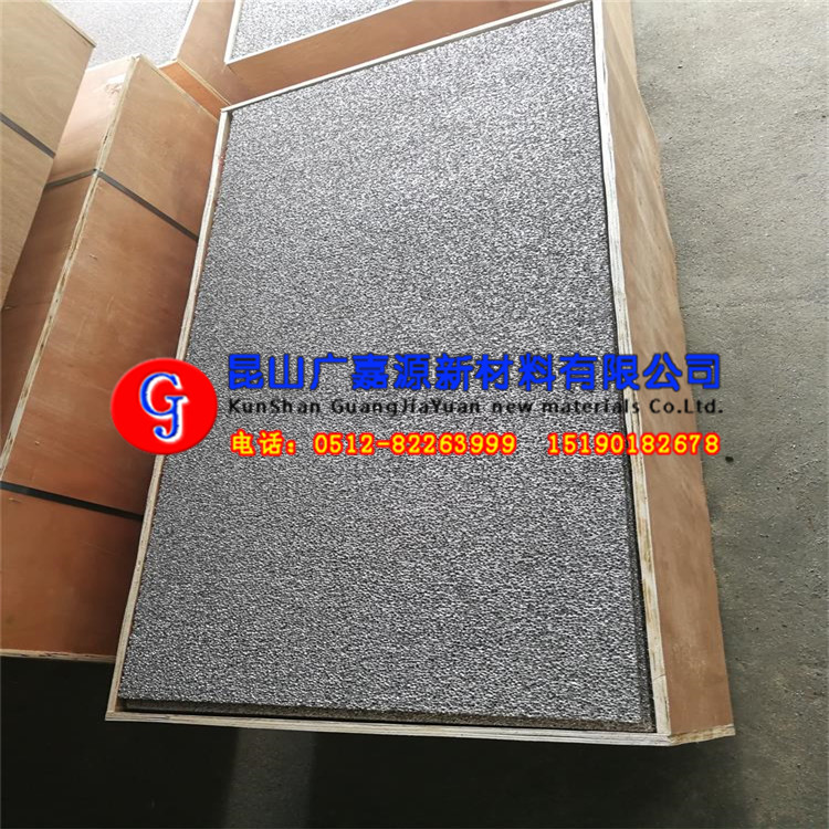 球体开孔型泡沫铝 孔径:3mm-13mm 密度:0.65-1.1g/cm3 厚度:5mm-130mm 耐热性:使用温度可达300℃ 吸音性能:声波频率在125--2000HZ之间时,吸声系数**大可达0.95,降噪系数超过0.4 保温性能:导温系数大约为铝的1/400; 电磁屏蔽性能:电磁波频率在2.6--18GHZ之间时,泡沫铝的电磁屏蔽量可达60--90dB 电阻率:为纯铝的100倍 耐腐蚀性:耐候性好,低吸湿,不老化,无毒性。 孔状:球体开孔型的孔洞连通部分由呈气泡舱和舱壁上的小圆孔组成,相当于用多个堆积紧密的空心球镂空了密实铝,形成了能允许气体或液体物质在铝体内流动通过的空间, 因此, 泡沫铝也被称作金属海绵。球体开孔型泡沫铝的气泡舱呈球状,相对规则,各个球体之间排列得非常紧密,每个舱壁上都开小圆孔连接其他的球体,开往6个方向,连通率超过90%。 球体由气孔连接的结构有利于对能量的吸收和过滤,由于不是直通孔,能量通过时经历球体和气孔的反复转换,流量和流速都会发生渐进式衰减变化。 用于吸声降噪,可通过对球体大小(直径2-13mm)、壁孔大小(直径0.5-4mm)、孔壁薄厚和板材厚度的设计和工艺控制,获得理想的应用效果。体积密度:约0.8g/。经建设部建材检测中心鉴定, 广嘉源泡沫铝的降噪系数超过国际标准,是目前国内外泡沫铝吸音材料的顶端产品,适用于各类运载工具箱体和机械设备的消音降噪。 用于抗冲击吸能,圆形的密堆积结构有无可比拟的优势:球形气泡舱、圆壁孔、舱壁相对规则,使球体开孔型在吸能抗撞击时更具有耐受能力。和气体发泡及缓释发泡法生产的闭孔型相比,在接受冲击能量时缓冲时间更长且不反弹。和其他类型的开孔型泡沫铝相比, 球体开孔型的抗压(44Mpa)、抗 折弯(27Mpa)强度高出很多,有显著的提升。