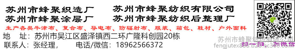 苏州市蜂聚纺织有限公司拥有喷水、喷气织机。专业生产服装面料、牛津布、箱包面料、导电布、画布、冲锋衣面料,softshell软壳面料,TPU、TPE和PTFE功能型面料,及常规麂皮绒、桃皮绒、灯芯绒,春亚纺,尼丝纺,塔丝隆,超细纤维双面绒,超细纤维无尘布,导电布等