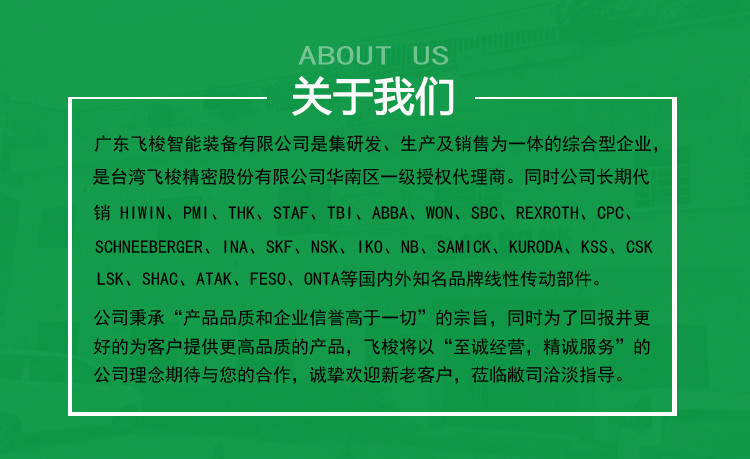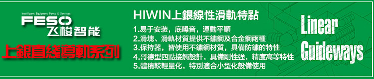 广东飞梭智能装备有限公司主要经营台湾HIWIN上银直线导轨、上银滚珠丝杆、KK模组、精密轴承、线性滑台、上银导轨WEH35CA滑块HGH65CA台湾HIWIN滚珠导轨等。