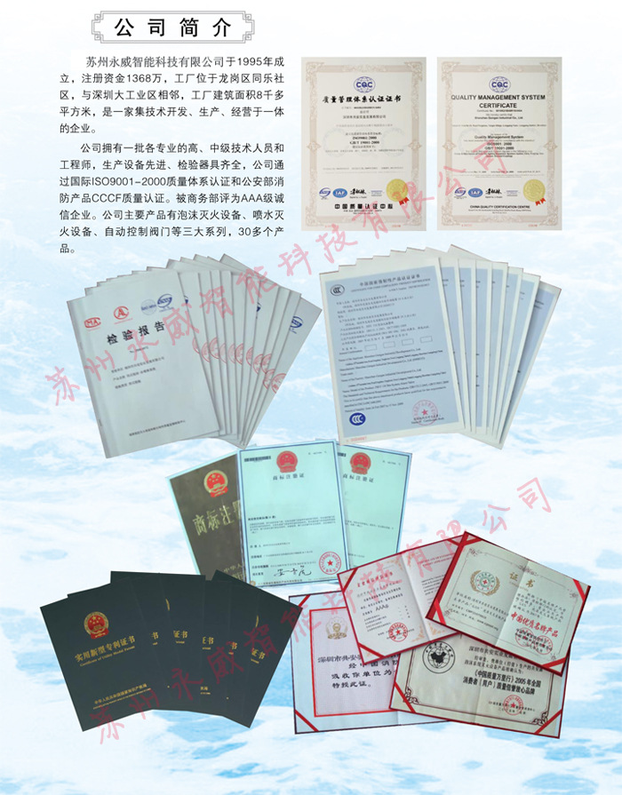 苏州永威智能科技有限公司已在同行业中率先通过ISO9001-2000国际质量体系认证,产品全部获得****部消防产品