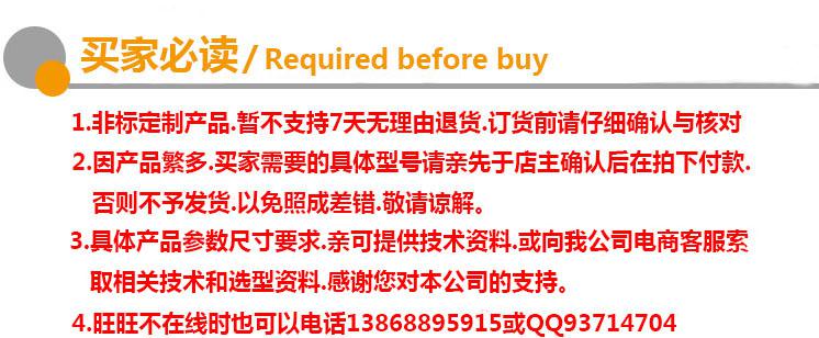 1、快递运费是按重量(公斤数)收取,模块不好设置,续重按公斤加收费用。店主没能把所有的产品都称重,且有按客户要求订做的非标产品,重量不能事先预知,故买家需拍产品,其它规格价格和运费敬请事先与店主联系后拍下付款。未事先联系拍下,没有确定邮费的,不发货,由些给亲带来损失,请自行承担!2、或敬请买家先拍下,再联系客服改价,客服根据你的数量用电子称称出重量后再修改邮费,给您带来的不便,敬请谅解!3、若亲购买宝贝数量较多,为节省亲的货运运费,建议使用货运物流发货,但需亲前往到货所在在城市货运物流站自提!4、敬请详细询问产品特性与使用情况说明等,以免亲订错产品致不能正常使用。非标订做或非常规产品非质量问题的,不能退货;亲订错产品或使用不当造成损失的,由亲自行承担!5、亲若拍下产品,当亲已熟知以上提示内容。