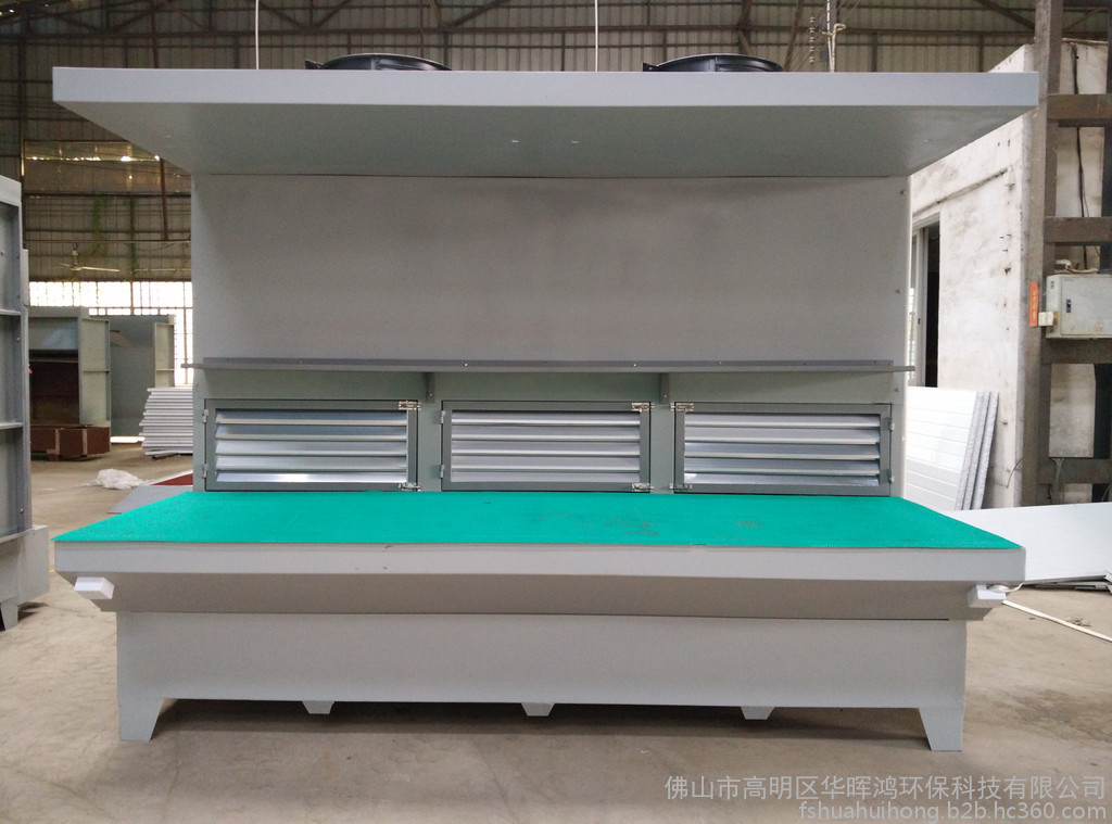 通过百叶窗侧面吸风与台面下吸风的方式吸尘,通过水帘清洗与过滤材料过滤后相对干净的空气排出来.