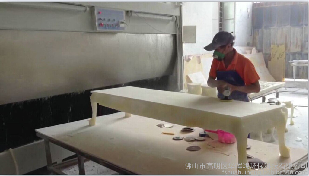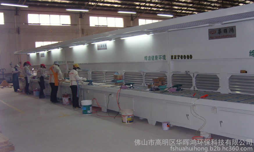 通过百叶窗侧面吸风与台面下吸风的方式吸尘,通过水帘清洗与过滤材料过滤后相对干净的空气排出来.