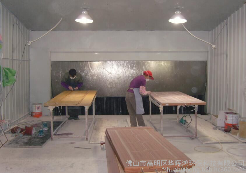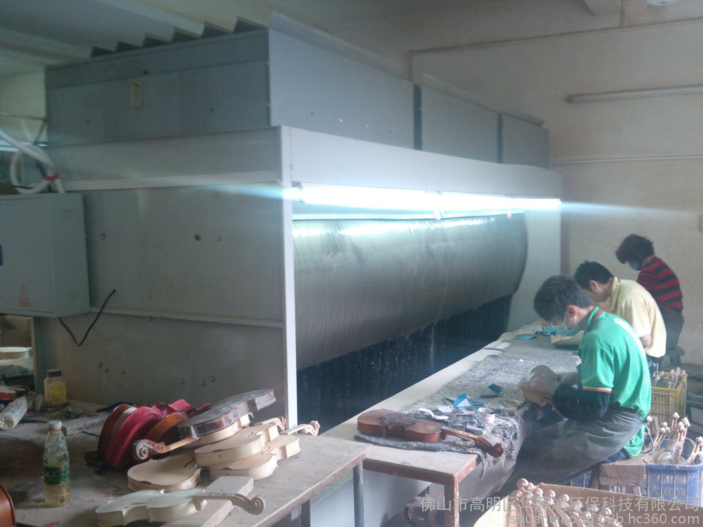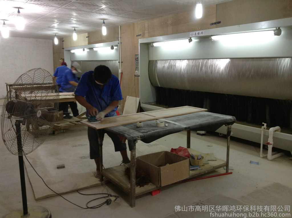 通过百叶窗侧面吸风与台面下吸风的方式吸尘,通过水帘清洗与过滤材料过滤后相对干净的空气排出来.
