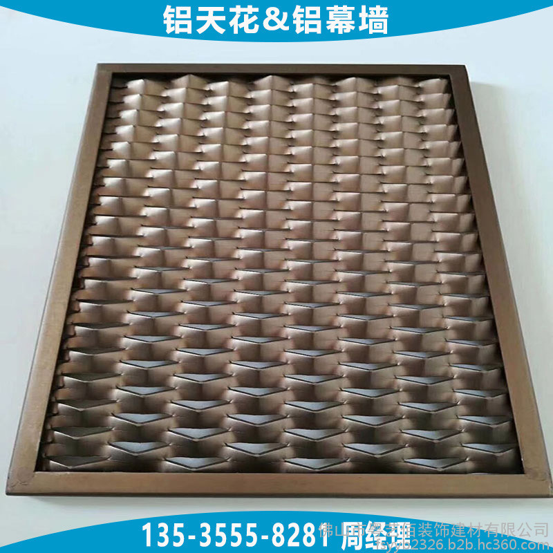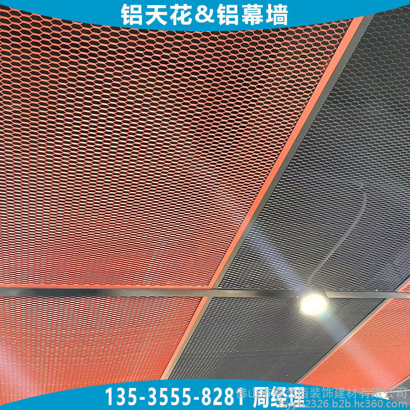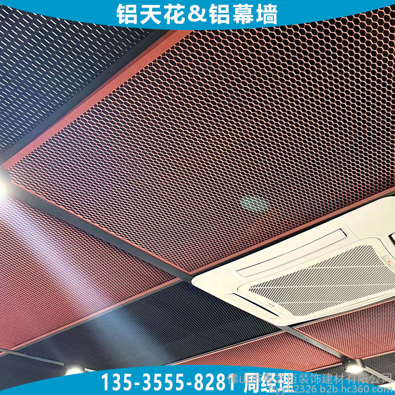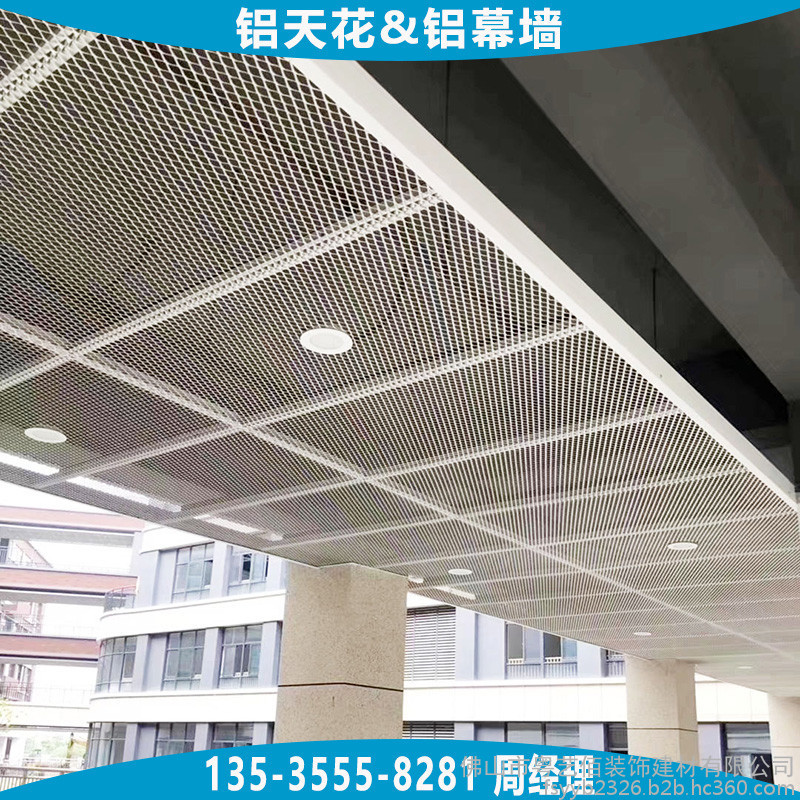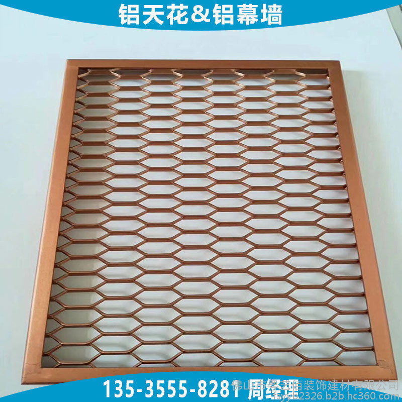 天花吊顶用铝拉网板根据铝网网孔的形状通常分为四边菱形孔铝网板、六边菱形孔铝网板,两种网孔形状均可用于天花吊顶及幕墙装饰,网孔的规格大小种类繁多,根据不同吊顶的层高、面积大小、装饰效果合理选用,能够平衡效果与成本。铝网板的材料造价通常与铝网板所选用铝板板材的厚度、网孔规格的大小、铝网的梗宽、铝网板配套的边框要求及烤漆工艺等直接相关,所以在订购时需向厂家提供较为详细的上述参数要求。
