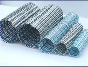 1.组成软式透水管的材料1)高碳钢丝:磷酸防锈处理、外覆PVC防止酸碱腐蚀,独特的钢线螺旋骨架确保管壁表面平整并承受压力。.2)不织布过滤层:确保有效过滤并防止沉积物进入管内。3)合成聚脂纤维:经纱采用被覆PVC的高强力特多龙纱或尼龙纱,纬纱使用特殊纤维,具有足够的抗拉强度。2.软式透水管[1] 具有的特点: 1)孔隙直径小,全方位透水,渗透性好;2)抗压耐拉强度高,使用寿命长; 3)耐腐蚀和抗微生物侵蚀性好;4)整体连续性好,接头少,衔接方便;