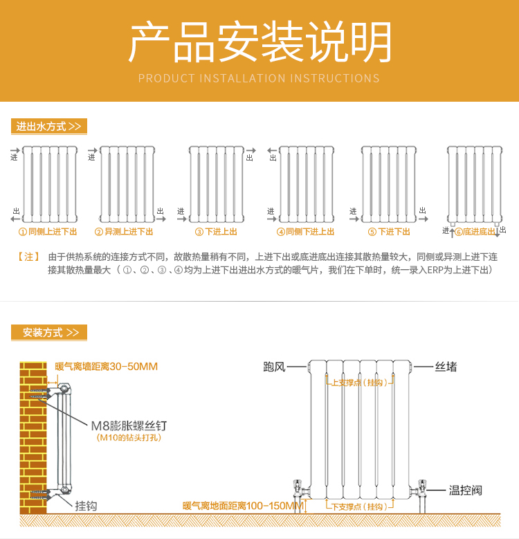 | 友情提示 1.安装完毕试水时,家中一定留人。如因为没留人导致的一系列损失 我们是不赔偿的 敬请理解(暖气片运输中难免磕碰 有的细微的磕碰肉眼看不到 需要蓄水之后才能知晓 所以试水的时候务必留人 发现漏水及时关闭!) 2.跑风应处于关闭状态。 3.不要晃动暖气片,暖气片和管路不要承重。 4.非专业人员不要拆装暖气片。 5.出现漏水时,要立即关闭进水、回水阀门。 6.钢制暖气片实行满水保养。 7.集中供暖的停暖一日内将暖气片进出水阀关闭 |