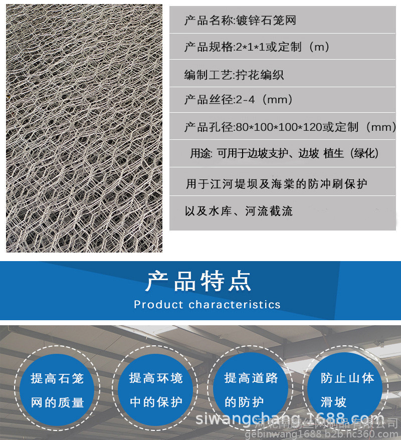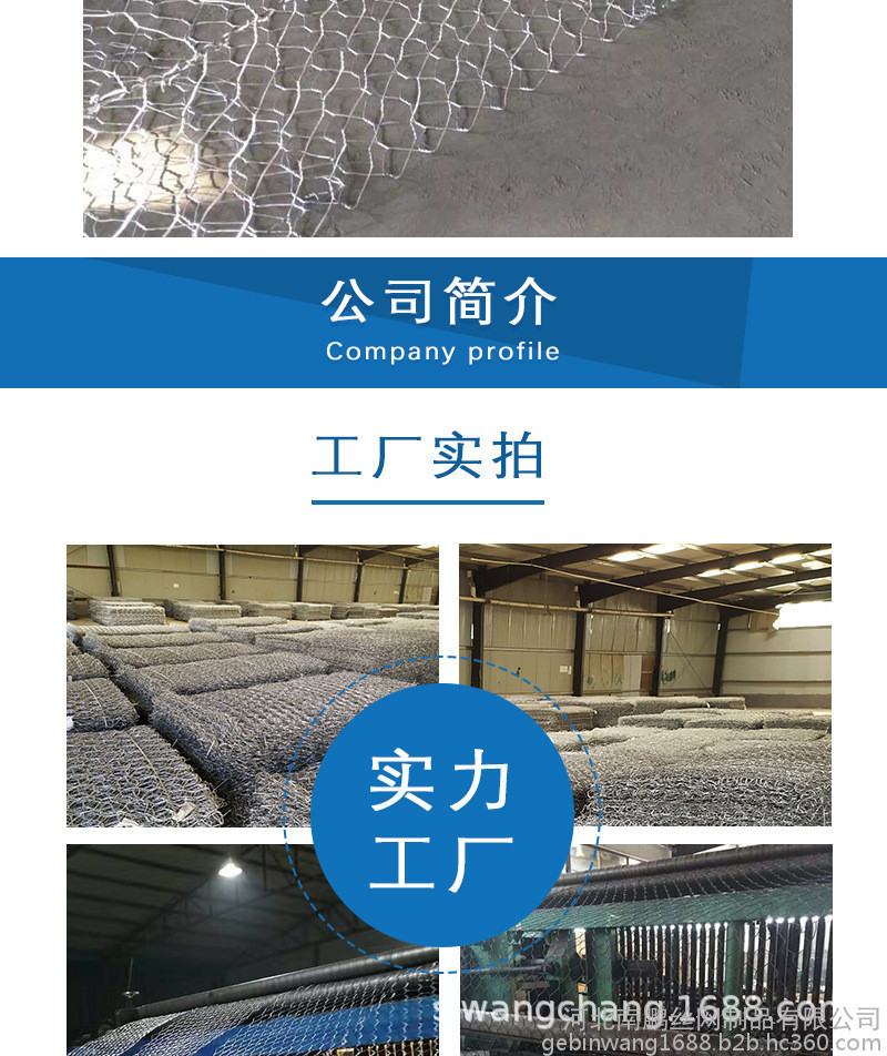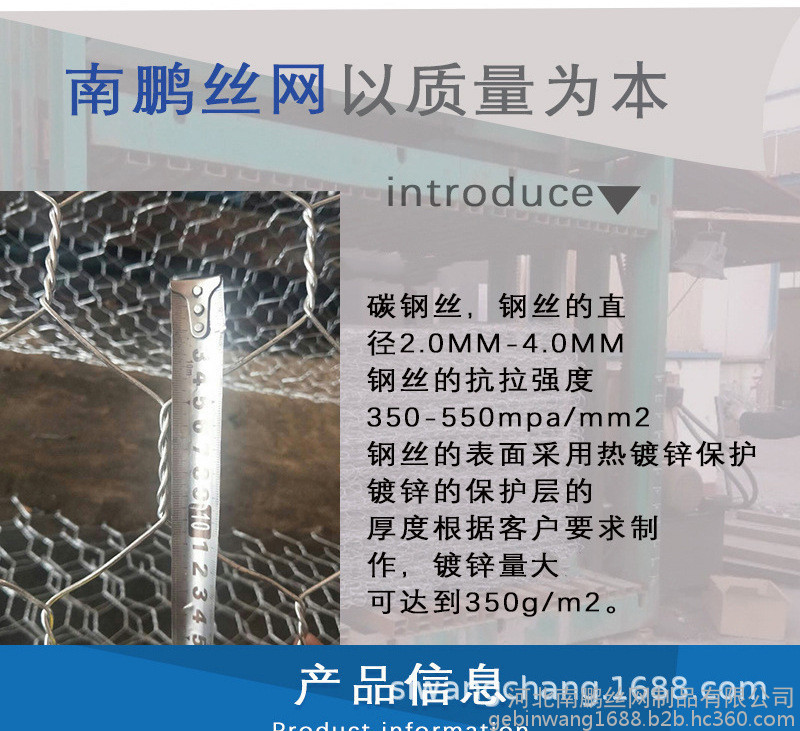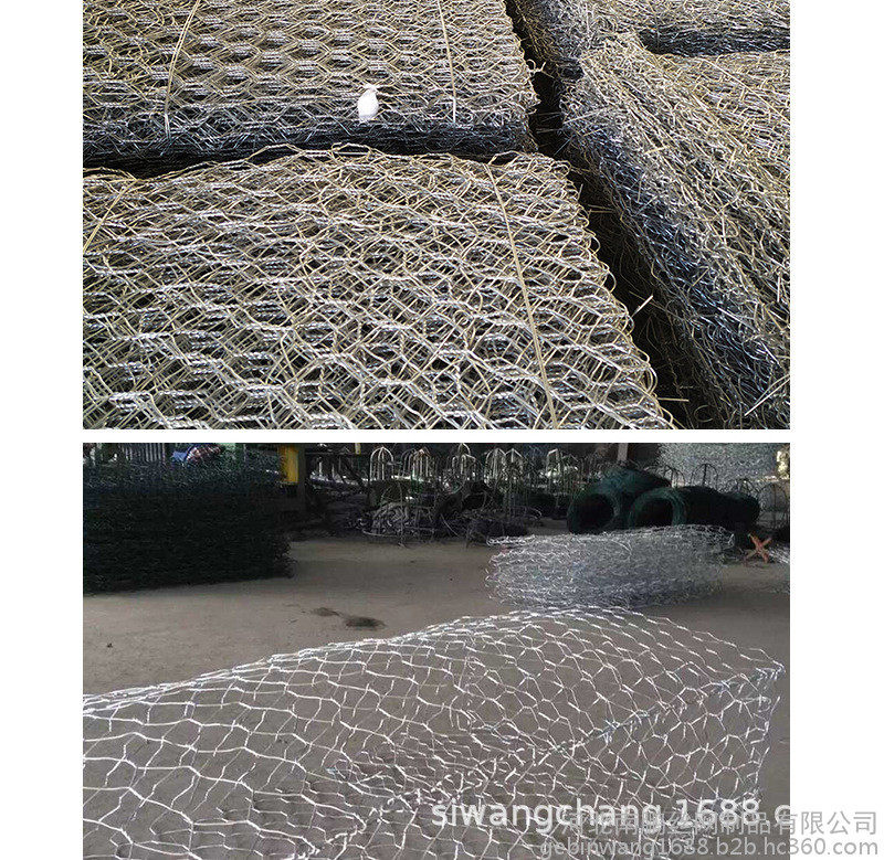 石笼网护垫分表面金属镀层和表面 PVC/PE涂层两个大类。使用的金属线径是根据六角形的大小而不同。生产过程是经织网,剪切,锁边,绑扎后制成石笼和护垫。石笼和护垫以折叠状态供货。