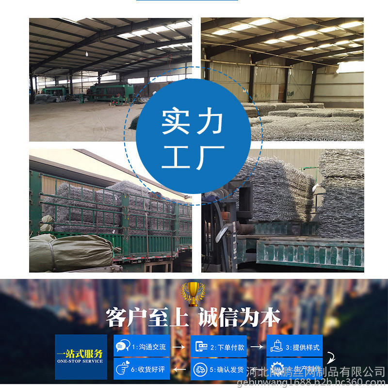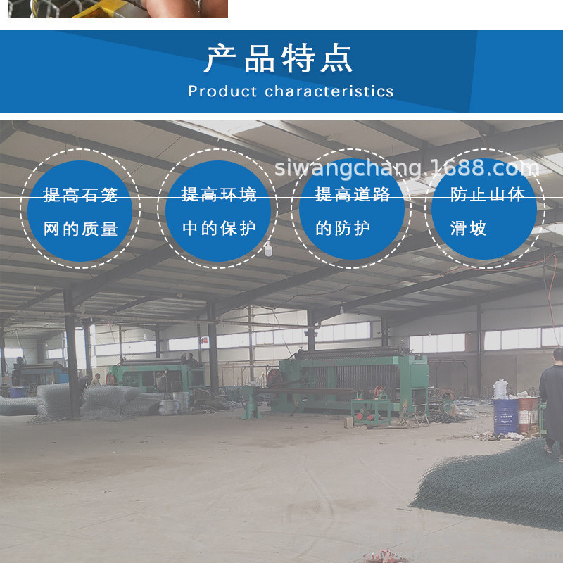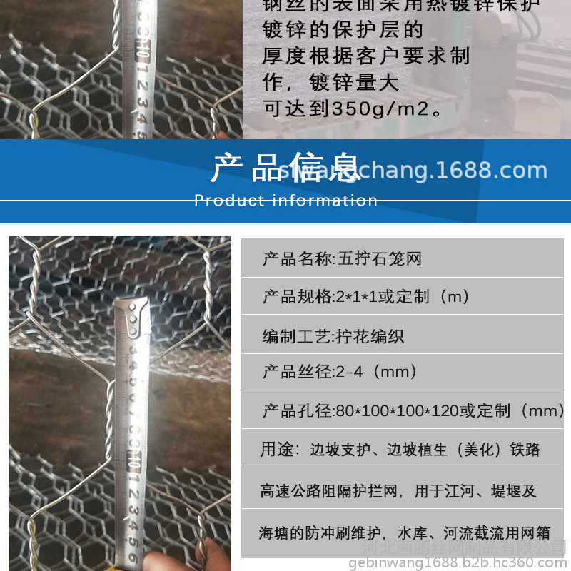石笼网护垫分表面金属镀层和表面 PVC/PE涂层两个大类。使用的金属线径是根据六角形的大小而不同。生产过程是经织网,剪切,锁边,绑扎后制成石笼和护垫。石笼和护垫以折叠状态供货。