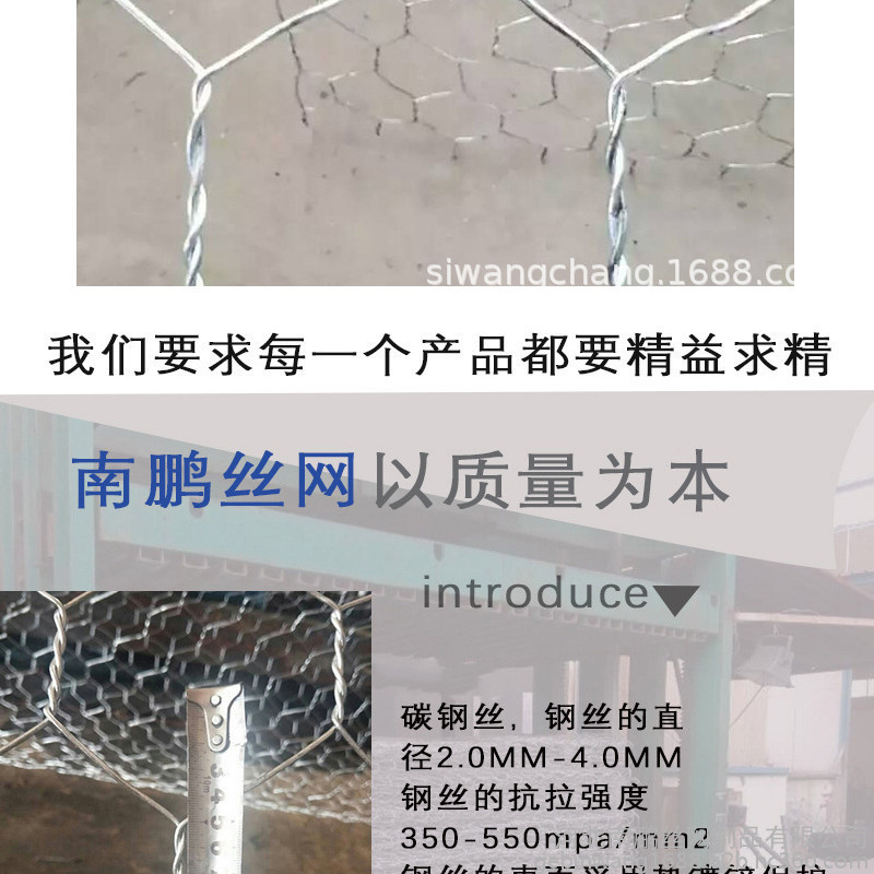石笼网是使用机器将金属线材单向搓捻两周编织的六角形网(六角网) 制成的网箱,厚度在0.15-0.5m(含0.5m),又称石笼和护垫,石笼网垫由隔板分成若干单元格,为了加强石笼网垫结构的强度,所有的面板边端均采用直径更大的钢丝。