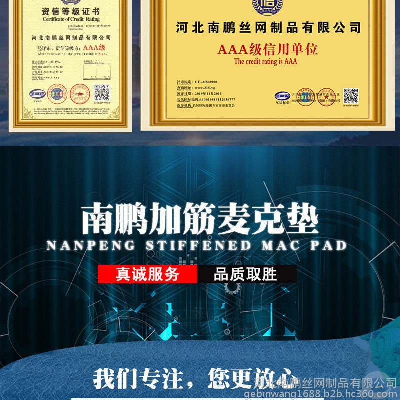 寿命长:加筋麦克垫的原材料为10%铝锌合金钢丝,优良的工艺基础保证了镀层厚度的均匀性,抗腐蚀性更强,保证其使用寿命(详细见技术文件)。