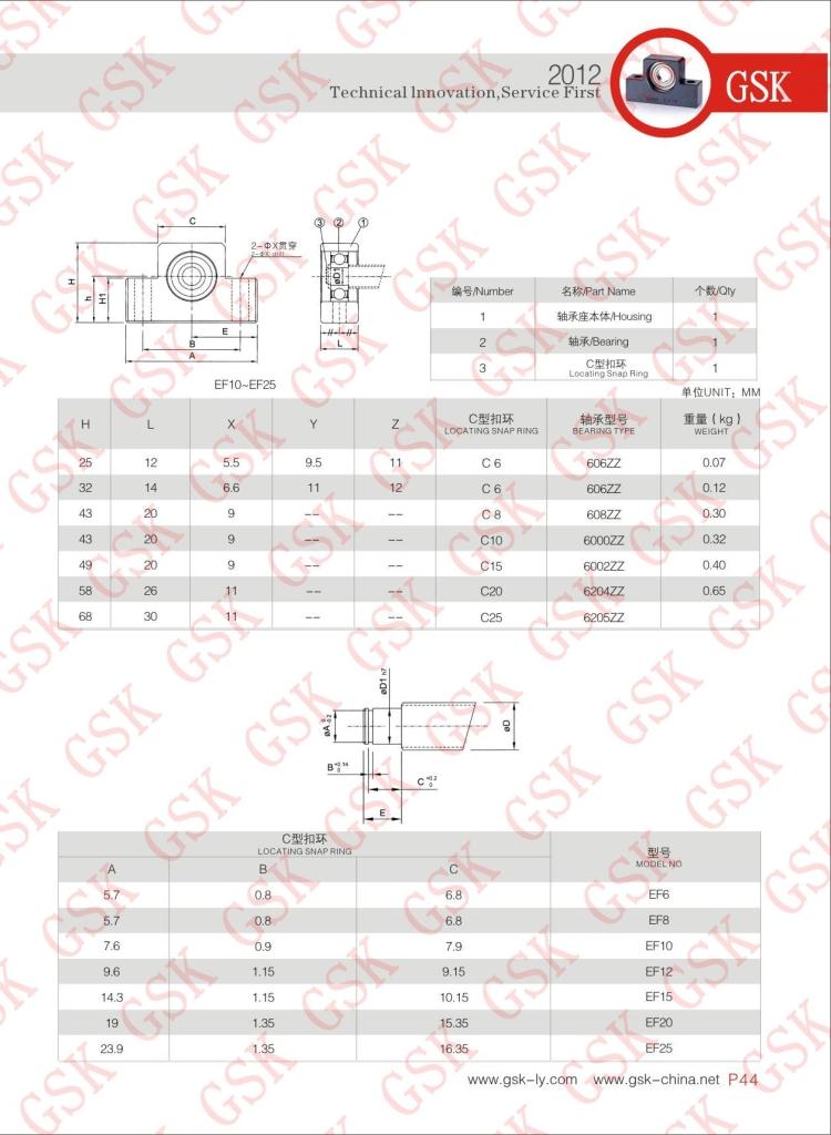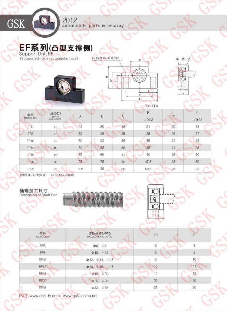 GSK滚珠丝杆支撑座(支持端):EF6、EF8、EF10、EF12、EF15、EF20、EF25.(采用UBC深沟球轴承)直线轴承、线性滑轨、滚珠丝杆、丝杆支撑座、双轴心直线导轨、滚轮轴承等专业制造(广泛应用于加工车床、CNC车床、电火花加工机床、各种磨床、切齿机床、重压机、包装机械、医疗机械、木工机械、食品机械、办公设备、机密测试仪、工具磨床、平面磨床和汽车制造设备。)