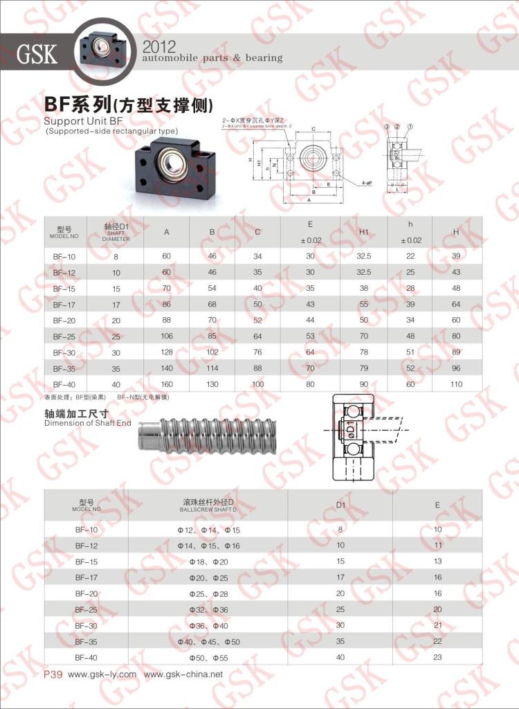 GSK滚珠丝杆支撑座(支持端):BF10、BF12、BF15、BF17、BF20、BF25、BF30、BF35、BF40.(采用UBC深沟球轴承)直线轴承、线性滑轨、滚珠丝杆、丝杆支撑座、双轴心直线导轨、滚轮轴承等专业制造(广泛应用于加工车床、CNC车床、电火花加工机床、各种磨床、切齿机床、重压机、包装机械、医疗机械、木工机械、食品机械、办公设备、机密测试仪、工具磨床、平面磨床和汽车制造设备。)