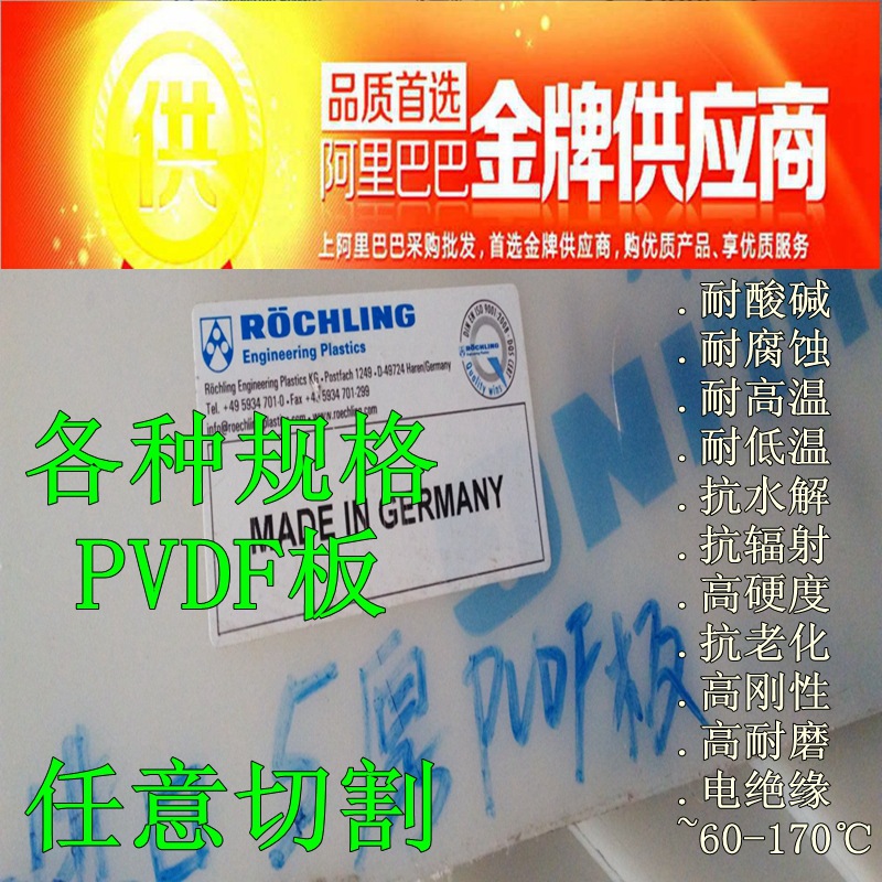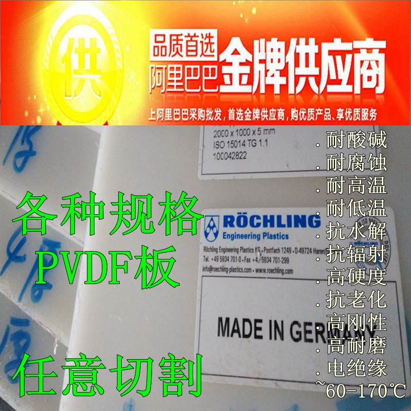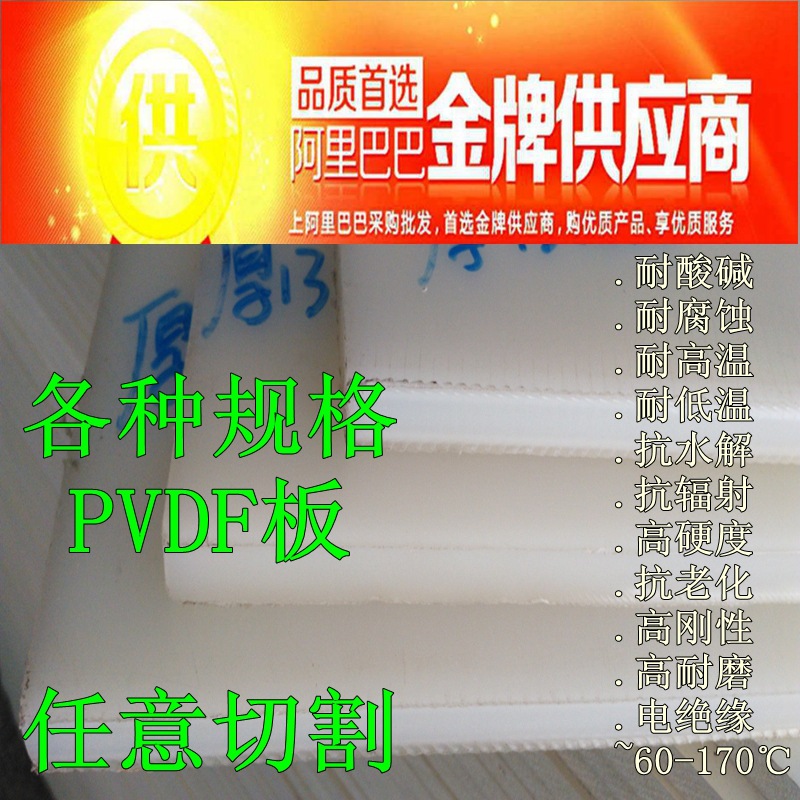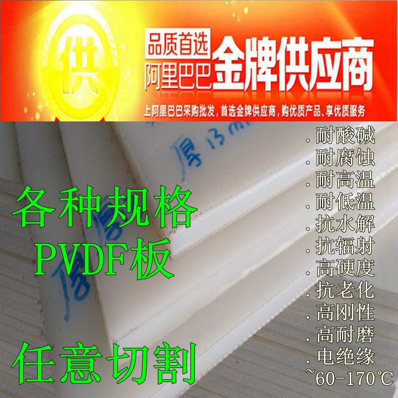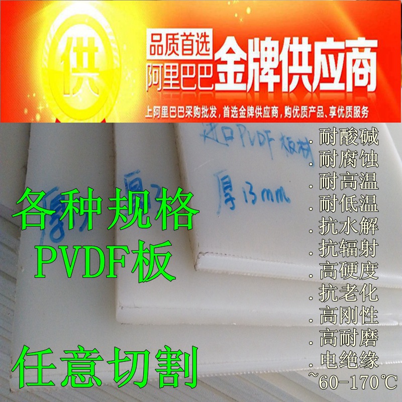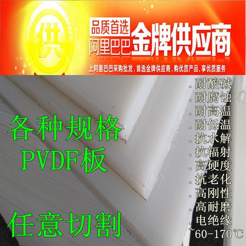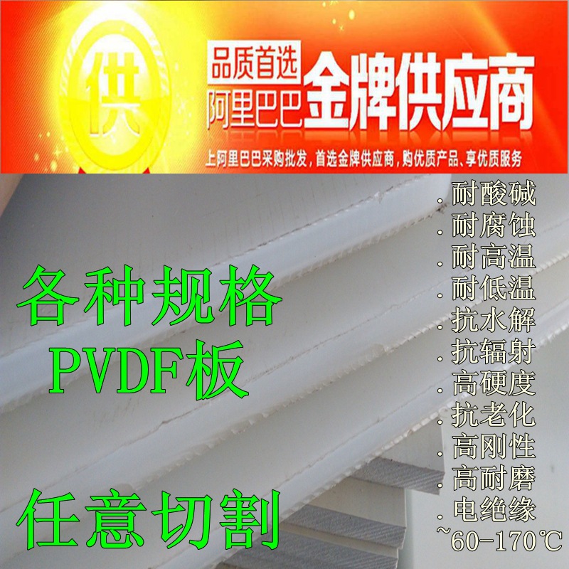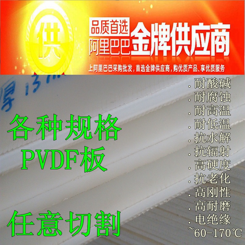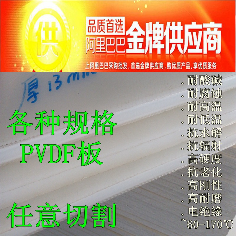 PVDF棒板 (白色/深灰色):中文聚二偏氟乙烯棒,英文名称 Polyvinylidene fluoride ,是用PVDF树脂经过高温挤出成棒材,是一种相当纯净的聚合物,它不含紫外稳定剂、热稳定剂、软化剂、润滑剂或阻燃剂等添加剂。PVDF板材可用PVDF焊条进行焊接成槽体和设备。用来承装各种化学液体。特别适合用于纯水系统和半导体行业中纯净化学试剂的传输。由于 PVDF 的化学惰性,它几乎不与任何介质发生反应。耐温度高(可在 172 度下持续工作),优良的抗化学腐蚀及抗水解性能,突出的抗紫外线和耐气候性能。机械强度高、刚性好、耐蠕变性能好、良好的滑动性和耐磨性能、固有的低可燃性,电绝缘性能好,主要产地有德国、美国、日本等地.性能参数表性质 试验标准 数据 性质 试验标准 数据密度 ISO1183 1.77g/cm3 体积电阻 VD0303 >1013xcm吸水性 DIN53495 0.04% 表面电阻 VDE0303 >1014化学抵抗性 ﹣ 介电常数1MHz DIN53483 7.25连续使用温度 ﹣30~150℃ 介电损耗因数1MHz DIN53483 0.18屈服抗拉强度 ISO527 50MPa 介电强度 VDE0303 22kv/mm屈服拉应变 ISO527 9% 泄漏电流强度 DIN5340 KC300极限抗拉强度 ISO527 46MPa 粘接性 0极限拉应变 ISO527 80% 无毒无害性 EEC90/128 ﹣抗冲击韧度 ISO179 252kJ/m2 摩擦系数 DIN53375 0.34缺口冲击韧度 ISO179 22kJ/m2 燃烧性能 UL94 V-0洛氏法球压硬度 ISO2039-1 80MPa 抗紫外线性能U.V ﹢邵氏D硬度 DIN53505 78 耐酸性 ﹢抗弯强度 ISO178 80MPa 耐碱性 ﹢弹性模量 ISO527 2000Mpa 耐碳酸水性 ﹢维卡软化温度 ISO306 140℃ 耐氯碳酸水性(CKW) ﹢热畸变温度 ISO75 145℃ 耐芳香族化合物性 ﹢热线性膨胀系数 DIN53752 1.2K-1*104 耐酮性 0热导率20℃ DIN52612 0.13w/(mxk) 耐热水性 ﹢PVDF棒特点:具有比同类的聚四氟乙烯更高的刚度和承压能力,但光滑性和电气绝缘性稍逊。它具有低温条件下的高强度和高韧性,可自行熄灭。其工作温度在-60℃到+150℃之间。 PVDF对氯化物,溴化物以及能量射线均可保持稳定。高温时酯和酮溶液均可对其造成侵蚀.PVDF板缺点:燃烧时含有氟的烟,不易粘接。PVDF板用途:半导体,液晶关联装置等的电子工业领域,化学装置领域,食品加工机器,包装机器的各种零部件、管道、密封件、泵部件、旋转碟、阀门、滑轨等。适用于石化、化工、冶金、食品、造纸、纺织、 管道,密封件,泵部件,旋转碟,阀门,止流阀,萃取离 心器,嵌齿轮,管道连接,滑轨。制药和原子能工业的元件制造。PVDF棒规格尺寸:6-200mm*510mm*1000mm,3-30mm*1000mm*2000mm