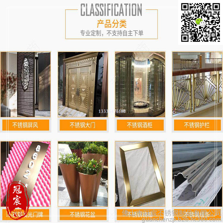 佛山市冠宸不锈钢制品有限公司位于中国佛山,是一家专业从事研发、生产钛金系列产品、 彩色不锈钢、艺术不锈钢产品的企业。产品有彩色不锈钢、不锈钢钛金板、不锈钢装饰板、不锈钢镜面板、不锈钢喷砂板、不锈钢蚀刻板等,加工工艺有镀钛加工、不锈钢镜面加工、不锈钢喷砂加工、玻璃喷砂加工、不锈钢蚀刻加工。我们的理念 : 创立世界品牌为目标,以客户满意为宗旨。佛山市冠宸不锈钢有限公司是一家拥有十年彩色不锈钢板、不锈钢蚀刻板、不锈钢钛金板、不锈钢装饰板表面处理经验的公司,现有高精度8K镜面、水镀黑钛、真空镀钛、蚀刻、压纹、彩色覆膜、镀铜等先进工艺.