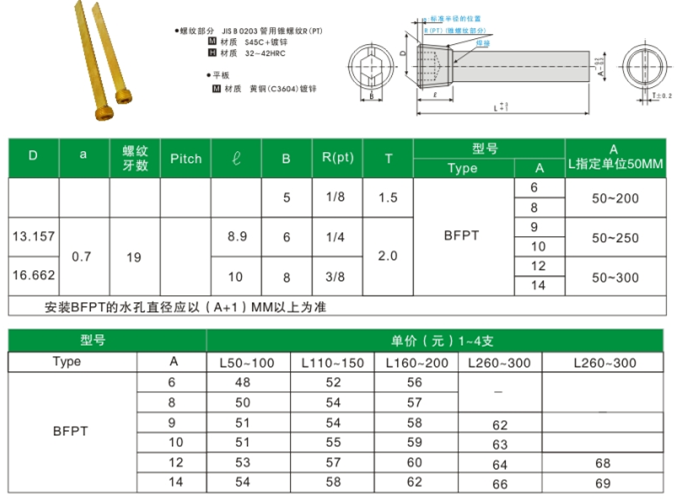 | 颜色分类 | BFPT 1/8*6*100 BFPT 1/4*10*100 |
