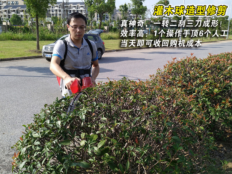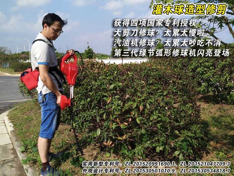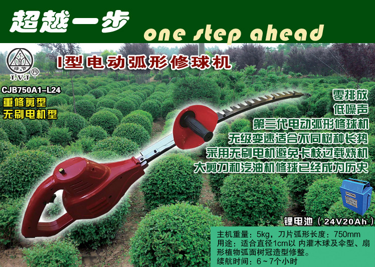 ??绿节牌锂电I型无刷电机电动弧形修球机产品系重修剪机型,“节能、低噪声、无污染”,适合直径1cm以内灌木球造型修剪和伞形植物弧形树冠造型。主机重:5.5kg,刀片弧形长度:750mm。电瓶配置:24伏20Ah锂电池1块。技术特征:①修剪后弧形树冠面整齐美观,易愈合萌发;②效率高:本机每天可修剪6亩,按现有雇工费用250元/人?天测算,每天可节省6个雇工成本1500元,两天收回购机成本;③采用高性能、长寿命、可无级变速的无刷电机,适合不同树种和长势,可避免卡枝过载烧机;④每天充电电费仅0.76元;⑤故障率低,续航时间6~7个小时。
