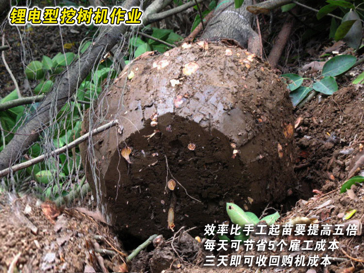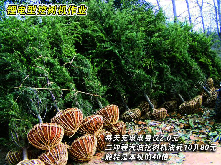 ??绿节牌锂电型便携式无刷电机电动挖树机产品“节能、低噪声、无污染”,适用于直径10cm以内苗木带土球的挖树。主机重:17kg,刀片宽度:80mm,铲刀长度:200mm。电瓶配置:48伏10Ah锂电池2块。技术特征:①适用于苗圃、园林工程苗木移栽过程中带土球的挖取或淘汰林木的采伐更新;②苗盘定位准确:可**保留苗木的根系及锅形土球,不伤根系;③每天充电电费仅2.14元;④采用高性能、长寿命、可无级变速的无刷电机,可避免卡刀过载烧机;⑤本机作业效率比手工挖树起苗要提高五倍左右,按现有雇工费用250元/人?天测算,每天节省5个雇工成本1250元,5天即可收回购机成本;⑥故障率低:不象汽油机“娇气”。