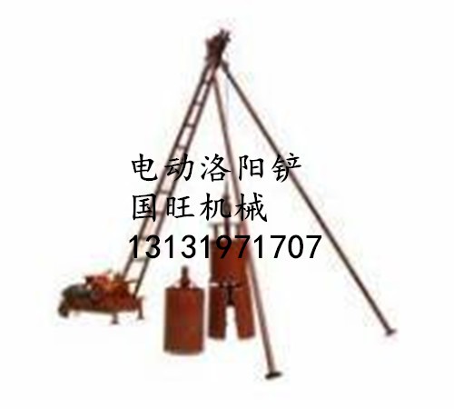 专门用于基本建设施工,可以打出口径30厘米至180厘米,深度8米至20余米的大口径深洞。里面加三合土或水泥灌注桩,起支撑基础作用。电动洛阳铲由卷扬机、三角架、钢丝绳、铲头等主要部件组成。铲头的制作比较特殊,呈圆柱体,上半部为配重,下半部为刃,由左右两片合围成圆筒形,利用铲头自重下落吃土,提起后电控开合铲刃,含土下落翻斗车。一般由2人操作1台电动洛阳铲,即1人操纵卷扬机,1人推小翻斗车运土。其工作效率是人工的15倍。还有一种是将铲头安装在拖拉机头上作业,便于搬运移动。