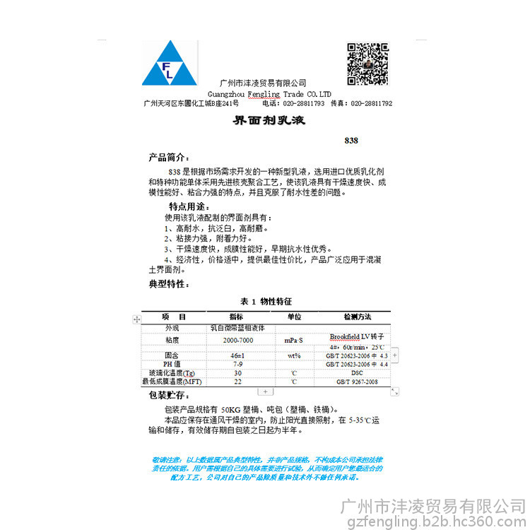 特 点:自交联乳液,优异的耐候性、耐水耐碱性,与底材的附着力好,与FL1100配合使用可以制备出有良好韧性、耐候性、低温稳定性和抗冲击力的水性工业涂料。单独使用是极好的面漆材料,高硬度光泽度,耐水性较好。