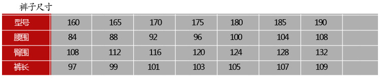 | 尺码 | 160 165 170 175 180 185 190 |