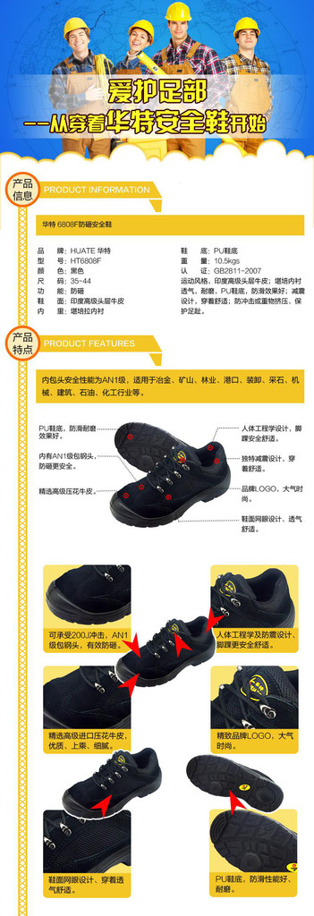 华特HT6808F防砸防安全鞋 牛皮 PU底 建筑工地**劳保鞋 厂家批发