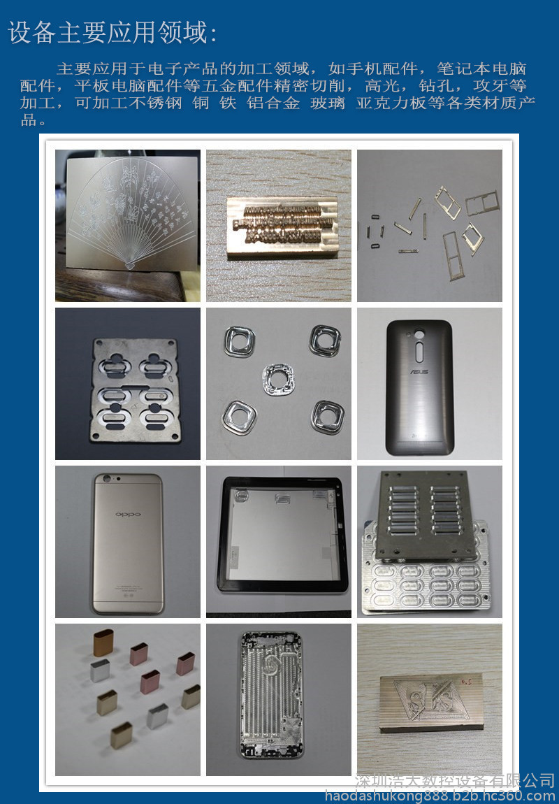 | 用途 | 各种材质配件的高光效果,五金配件的铣削,玻璃陶瓷开孔及磨边。五金首饰的加工。手机中框加工,手机屏幕及 |