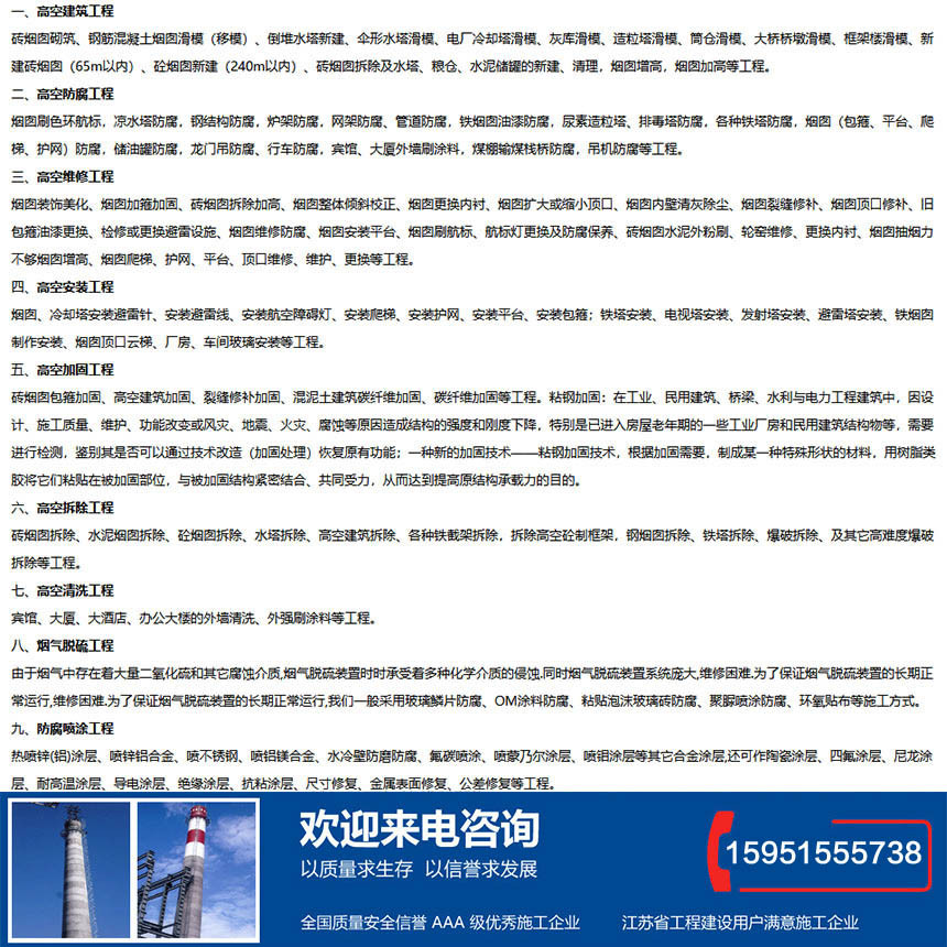 江苏浩久高空建筑防腐有限公司是一家具备高耸构筑物【浩久高空】高空维修防腐,脱硫塔防腐,脱硫喷枪工程专业承包资质的施工企业。我公司多年来专业从事各种高空作业、高空建筑、高空维修、高空防腐、高空建构造物拆除安装,烟囱脱硫,防水堵漏,烟囱裂缝加固,拆除加高等工程。 由于我公司在施工中采取了的工艺和可靠的保障措施,使上述工程均“样板工程” “工程”,受到有关业主的高度评价。江苏浩久高空建筑防腐有限公司愿以多年来丰富的施工,各家业主服务,竭诚为广大用户提供满意、理想、优惠的产品。
