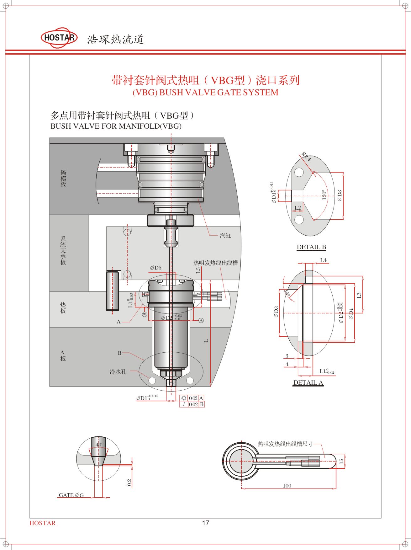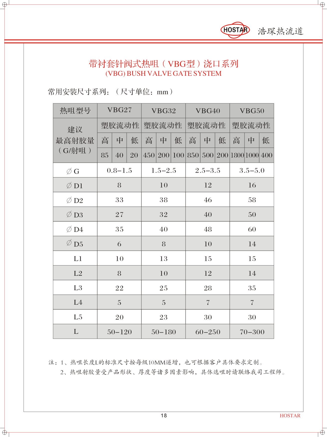 浩琛VBG型针阀热咀用在一模一腔塑胶制品的单个热咀,一模一腔及一模多腔塑胶制品,需由分流板分流到多个入胶口用的多个热咀;因塑胶制品外观、较难注塑的大型、薄肉制品及叠层模具使用,也可适用于大多数塑料制品注塑**咀芯样式与结晶性和非结晶性塑料注塑相关;浇口直径的正确选用与制品外观,制品结构及模具结构相关。根据塑胶制品材料特性、制品结构、模具结构,浩琛可提供VBG27、VBG32、VBG40、VBG50四种模具开框尺寸规格供客户选用,热咀长度可随模具模板尺寸定制。