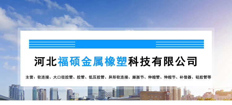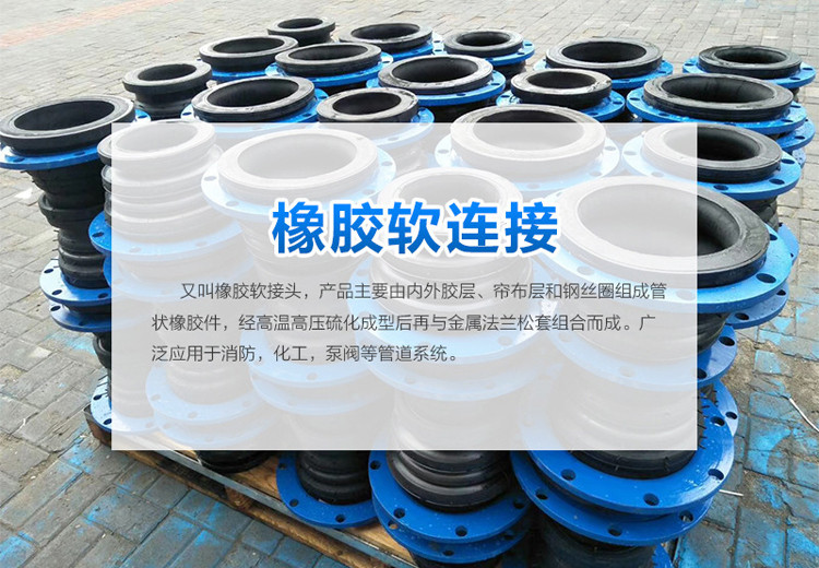 橡胶软接头由碳钢、不锈钢 、活套法兰和橡胶球体构成,中间橡胶球体起到减震、吸收管道位移的作用,橡胶球体内部由内胶层、锦纶帘子布增强、外胶层复合组成。我厂生产的橡胶接头具有耐压高、弹性好、位移量大、吸收振动、降低噪音效果好、安装方便等特点,广泛用于供水排水、循环水、暖通空调、造纸、石油化工、船舶、水泵、压缩机、风机等管道系统。