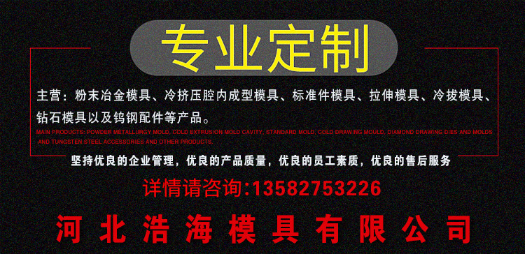 我公司专业生产粉末冶金模具、冷挤压腔内成型模具、标准件模具、拉伸模具、冷拔模具、钻石模具以及钨钢配件等产品。