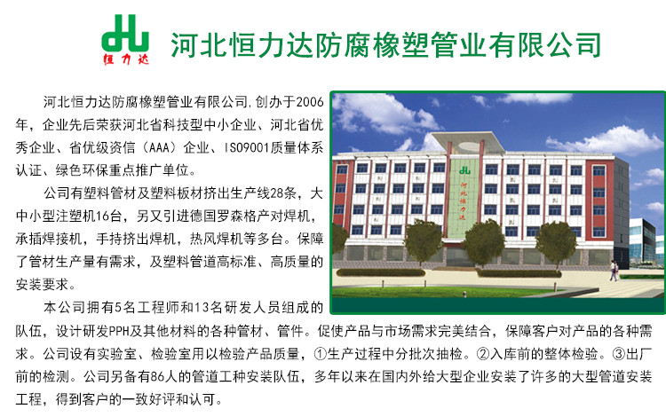 聚丙烯(PP)、聚丙烯(PPH)、玻纤增强聚丙烯(FRPP),管件包括:三通、法兰、弯头、直接、变径、四通等。阀门包括:蝶阀、球阀、截止阀、隔膜阀、止回阀、风阀等,规格为DN15-DN600,工作压力PN0.6_PN1.0。产品具有耐腐蚀、抗渗漏、卫生无毒、阻力小、使用寿命长、安装维修方便、工程造价低等特点,已广泛应用于化工、制药、化纤、给排水工程、污水处理等领域的腐蚀性介质输送,同时适用于冶金行业酸洗及废酸回收再生工艺,产品实行三包。耐酸碱性能比较好。价格优,欢迎采购。