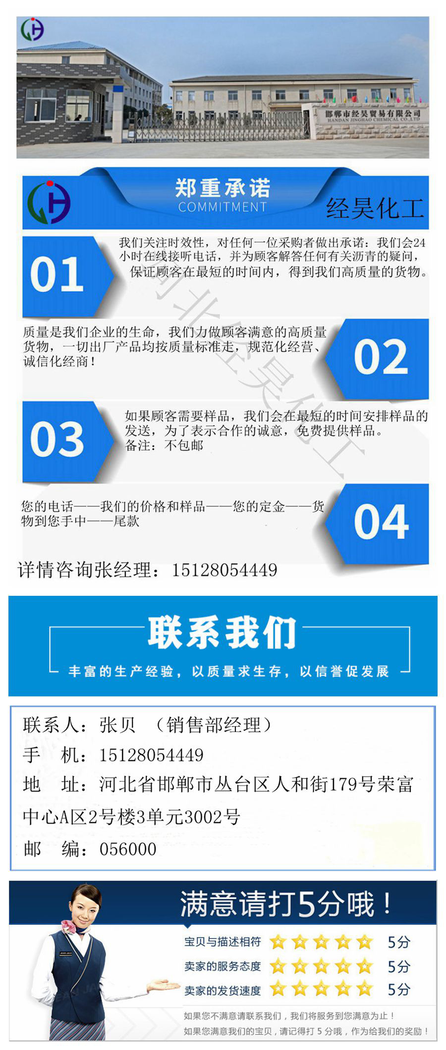邯郸市经昊化工有限公司始建于2006年,成立于2016年12月是冀南一家煤焦化产品经销公司.拥有海关总署签发的自主货物进出口权.公司主营高中温沥青、改质沥青、片状沥青、球状沥青、沥青粉等各种**沥青和燃料油、烧火油等煤焦化产品.公司仓储占地50亩.投资1500余万元.年生产能力10000吨以上,有自己的大型化验室,仓储车间.运输车队.物流网络.拥有三家子公司,公司设有科研工作站、工程实验室、生产车间、销售团队、运输车队等部门。公司投资20余万元,引进沥青和燃料油检测设备(包括软化点测试仪、灰份测试仪、结焦值测试仪、固定碳测试仪、水份测试仪、热值测试仪等检测设备)。公司现有员工100余名,本科以上专业技术人员占公司总人数60%。公司始终坚持以人为本的科学发展观,以科技投入为先导.以**服务为保障.不断开拓创新,以时俱进,在短短的时间内成**了不俗的业绩,每月公司都于翻倍的形势发展.部门分三个部门,分别为进出口管理调度部门.二为采购部门.三为销售部门。公司恪守:“有你方有我”的商业理念,坚持“诚信为本、和谐共赢”的经营原则,只要您需要,我们将尽全力帮您解决所需,真诚期待与您精诚合作、互惠互利、共同发展创大业!