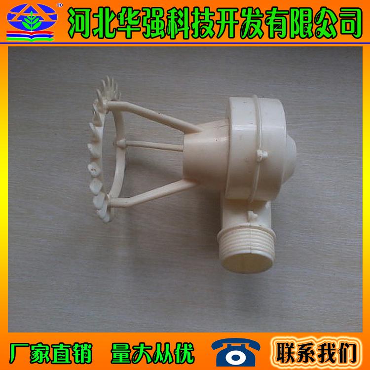 喷溅装置的工作原理是:压力水沿切向水平进入蜗型喷头,在腔体内旋转并向下作回旋运动,从下方喷嘴喷出。水喷出后形成一伞状旋转水体,冲击溅水条及溅水叶片,溅散成均匀分布雾状细小水滴,下落到填料顶面。散热效果好,特别适用于冷却水。