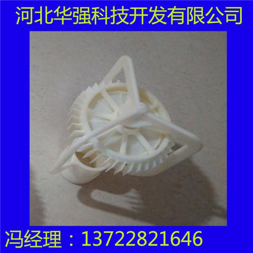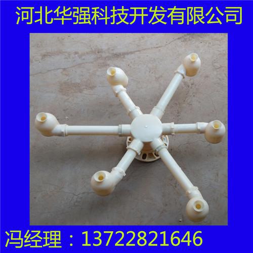 我公司生产各种冷却塔喷溅装置ABS三溅式喷头,具有与配水管相连的承插式接口,承插接口采用钻尾丝固定,在承插接口的下部还依次同轴间隔设置有外径依次变小的大溅水盘、小溅水盘和锥形辟水头;并且由至少两支圆周排列立式设置的连杆固定在承插接口上,在大溅水盘和小溅水盘上还分别设置有与锥形管嘴同轴且与锥形管嘴下口内径相比内径依次变小的大漏水孔和小漏水孔,大溅水盘和小溅水盘为弧面朝上的半球形,锥形辟水头为锥角向上的锥形。特点: 改进型喷溅装置的工作原理是:压力水沿切向水平进入蜗型喷头,在腔体内旋转并向下作回旋运动,从下方喷嘴喷出。水喷出后形成一伞状旋转水体,冲击溅水条及溅水叶片,溅散成均匀分布雾状细小水滴,下落到填料顶面。散热效果好,特别适用于电厂冷却水。