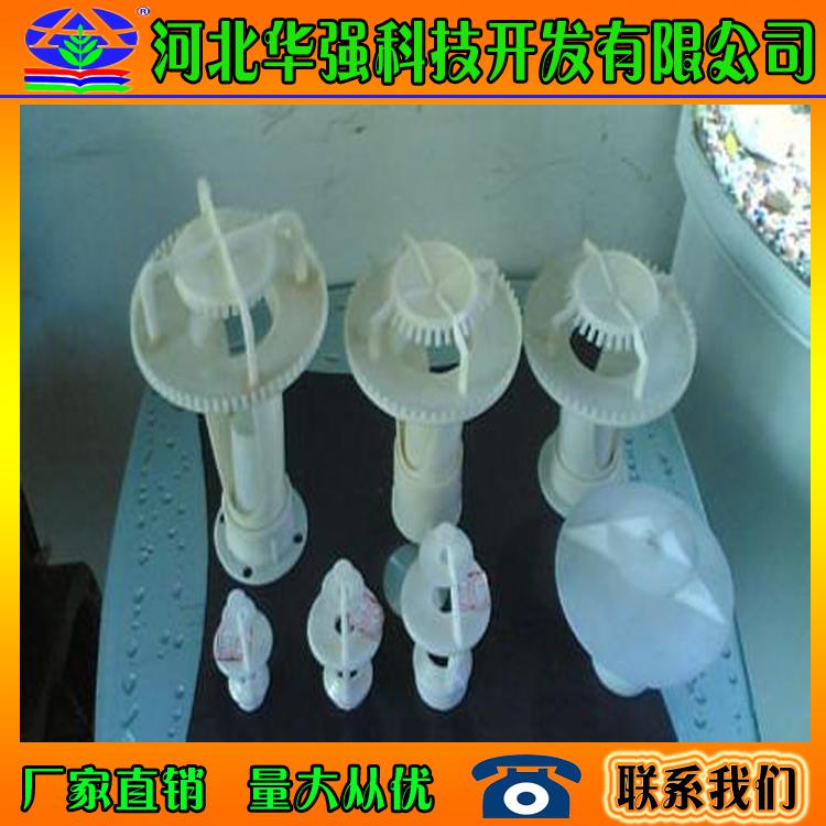 ??冷却塔用喷头装置的工作原理是:压力水沿切向水平进入蜗型喷头,在腔体内旋转并向下作回旋运动,从下方喷嘴喷出。水喷出后形成一伞状旋转水体,冲击溅水条及溅水叶片,溅散成均匀分布雾状细小水滴,下落到填料顶面。