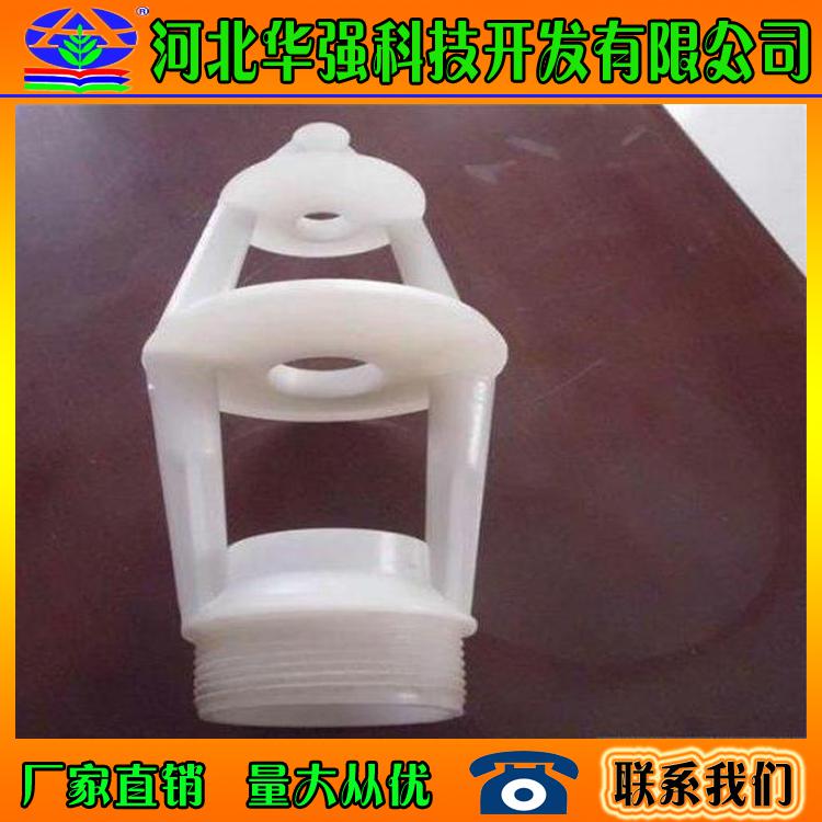冷却塔用喷溅装置是一种三溅式喷头。具有与配水管相连的承插式 瓶形接口和锥形管嘴,在锥形管嘴的下部还依次同轴间隔设置有外径依次变小的大溅水盘、小溅水盘和锥形辟水头;并且由至少两支圆周排列立式设置的连杆固定在承插式瓶形接口上,在大溅水盘和小溅水盘上还分别设置有与锥形管嘴同轴且与锥形管嘴下口内径相比内径依次变小的大漏水孔和小漏水孔,大溅水盘和小溅水盘为弧面朝上的半球形,锥形辟水头为锥角向上的锥形。