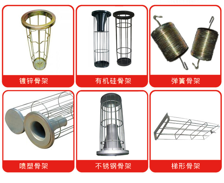 除尘滤袋骨架也称除尘布袋骨架主要是根据客户的要求定制为主,通常可分为圆形、梯形、信封型、弹簧式等几种形状,根据安装环境的不同焊接好的布袋骨架处理方式又可分为镀锌、喷塑、有机硅几种形式。客户在订购布袋骨架使还应说明骨架质量的要求,如纵筋的多少与粗细,布袋骨架的长度与直径,是否包含文氏管都应说明,以免影响