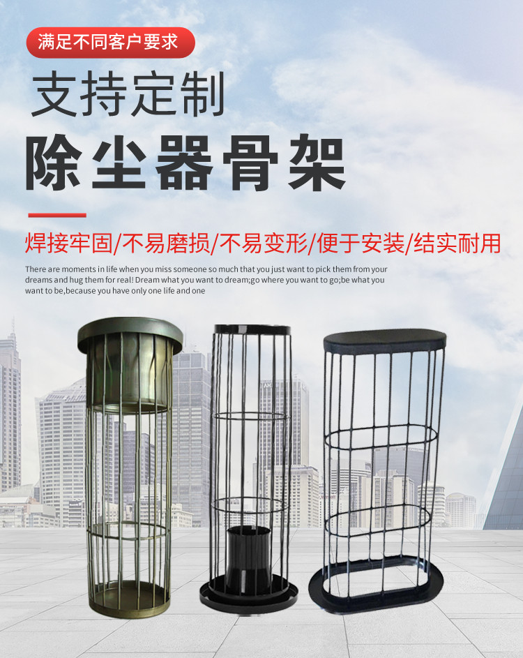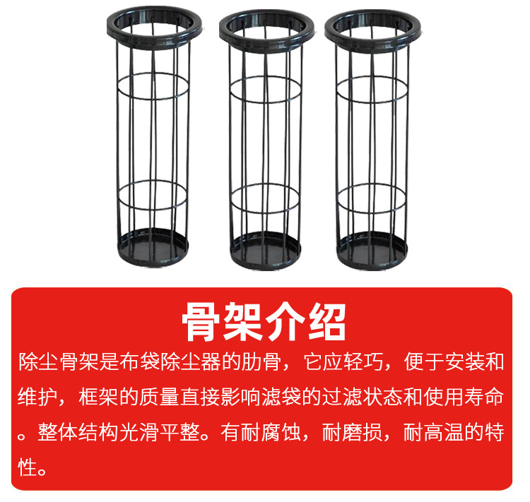 除尘滤袋骨架为方便安装可分为单节式与多节式中间采用旋转式连接,多节式滤袋骨架 主要用于4米以上的安装环境,具有安装便捷,实用性强的特点,根据安装环境与使用温度和腐蚀性的要求除尘滤袋骨架表面处理可分为镀锌、有机硅、喷塑等来满足不同的要求,是袋式除尘器中必不可少的配件,在工业除尘过程中起着重要的作用。