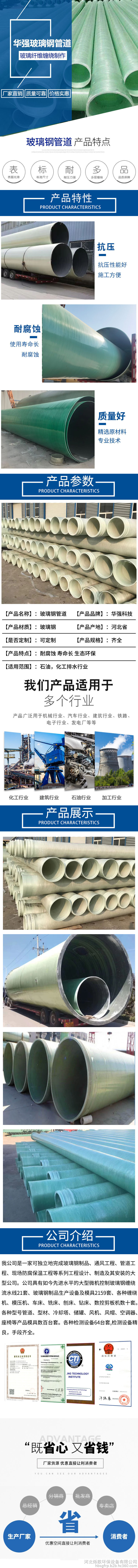 玻璃钢管道是一种轻质、高强、耐腐蚀的非金属管道。它是具有树脂基体重的玻璃钢纤维按工艺要求逐层缠绕在旋转的芯模上,并在纤维之间远距离均匀地铺上石英砂作为夹砂层,能充分发挥材料的作用,在满足使用强度的前题下,提高了钢度,证了产品的稳定性和可靠性。玻璃钢夹砂管以其优异的耐化学腐蚀、轻质高强,不结垢,抗震性强,与普通钢管比较使用寿命长,综合造价低,安装快捷,安全可靠等优点,被广大用户所接受。