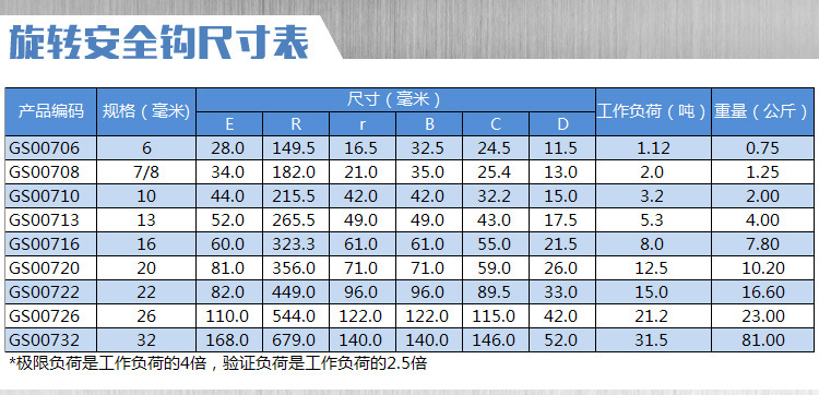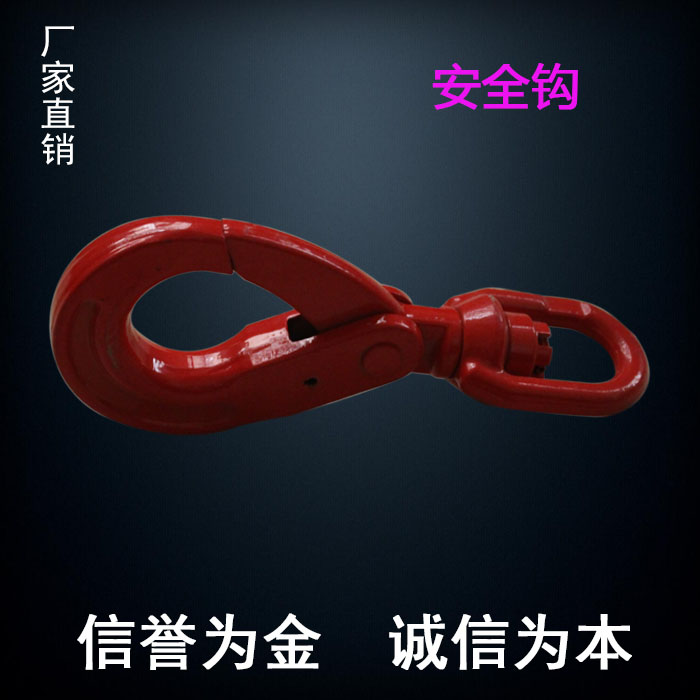 该旋转安全钩吊装货物时有安全舌片能有效保护好钢丝、链条等滑出以确保安全;旋转部分的设计在吊货时能够灵活旋转。