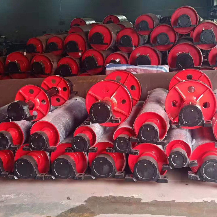 滚筒是输送机传递动力的部件。传动滚筒表面有裸露光钢面,人字形和菱形花纹橡胶覆面。小功率、小带宽及环境干燥时可采用裸露光钢面。人字形花纹胶面摩擦系数大,防滑性和排水性好,但有方向性。菱形胶面用于双向运行的输送机。