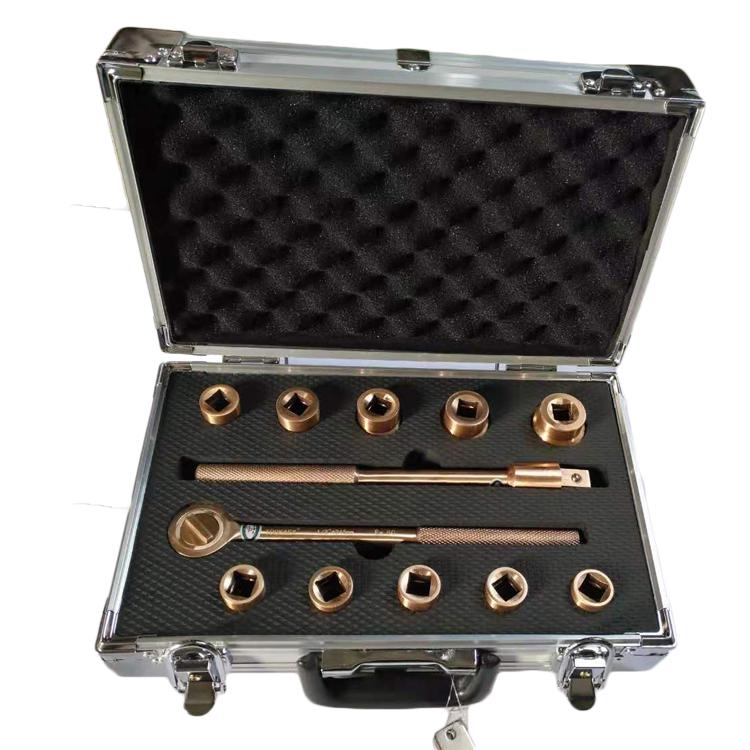 套筒内孔形状多为六角孔或十二角孔;材质为铍青铜合金、铝青铜合金两种;一般套筒为组件形式出现,并配有手柄、接杆、万向接头、旋具接头等多种附件。防爆套筒扳手适用于各种易燃、易爆工作环境下,紧固或拆卸六角头螺栓、螺母(尤其适用于空间狭小、位置深凹的工作场合)。