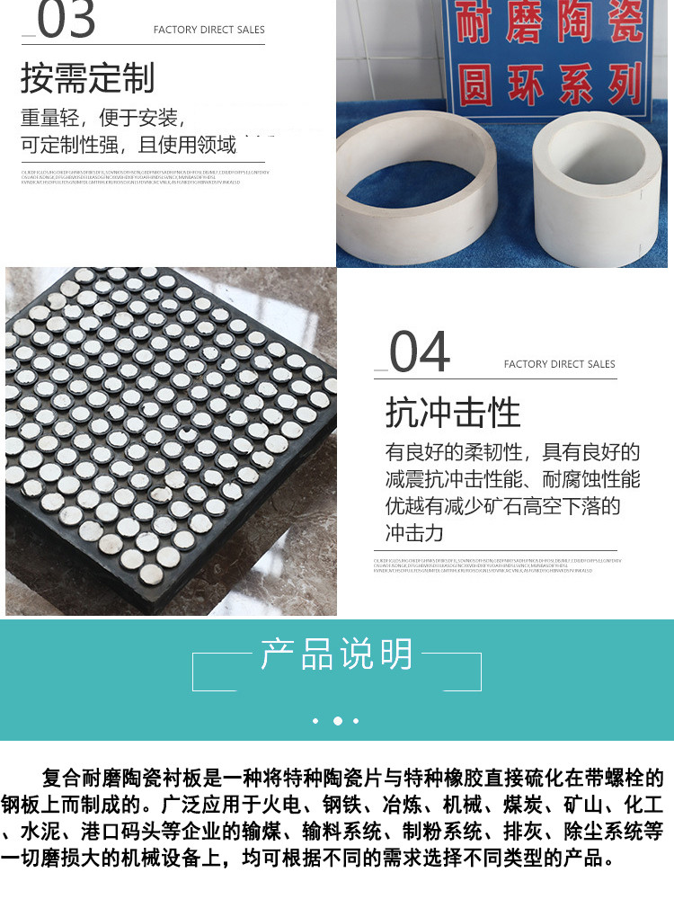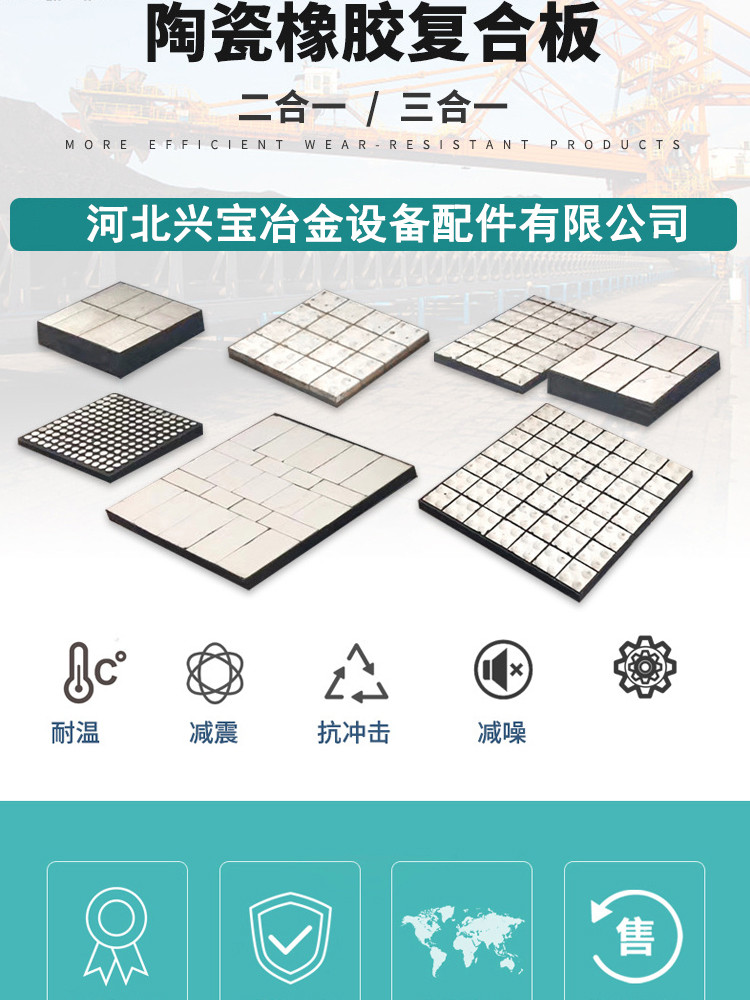 陶瓷橡胶复合衬板是采用先进的热硫化工艺,将增韧耐磨陶瓷和橡胶硫化在一起,再用高强度有机粘合剂将衬板粘接在设备的内壳钢板上,形成坚固且有缓冲力的防磨层。它结合了陶瓷的高硬度和橡胶的高缓冲及抗疲劳性能方面的优点,可以很好地解决大块物料输送过程中的设备防磨问题。橡胶的加入,除具有良好的抗磨损和防腐蚀作用外,也能防止因物料聚集造成停产和降低噪声。 也可以直接将增韧耐磨陶瓷片和特种橡胶硫化在带沉头螺栓的钢板上,构成各种形状的耐磨衬板,方便安装和更换。